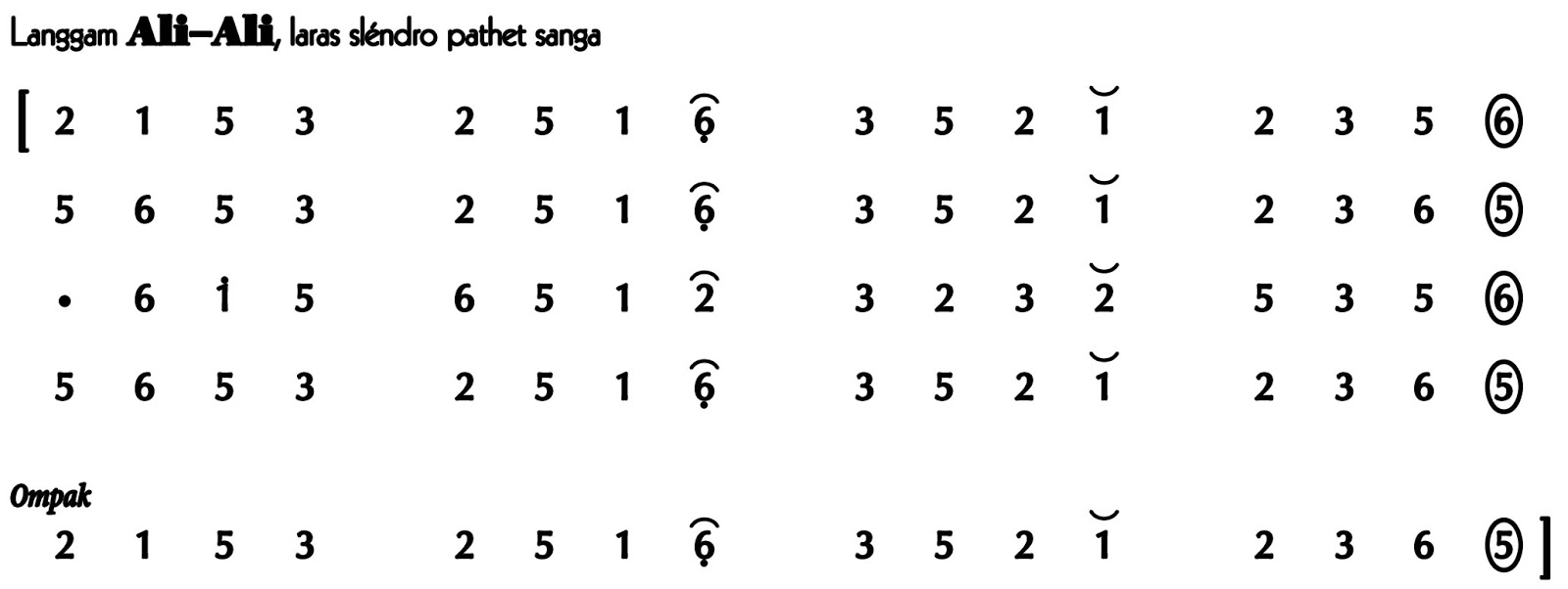 Langgam “Ali-Ali” adalah gending Jawa berbentuk langgam dengan mengambil nada atau titi laras Slendro 9. Berikut not angka langgam “Ali-Ali” Slendro 9 lengkap.